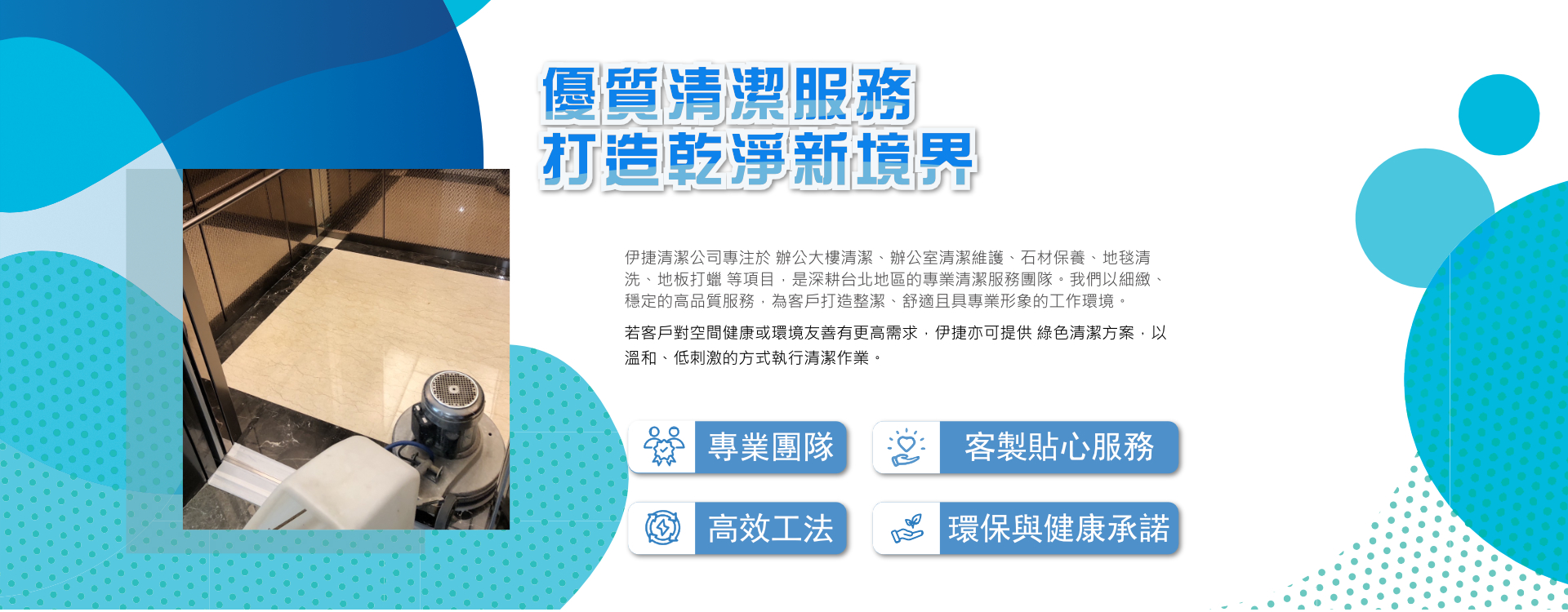 本公司有經驗豐富的專業團隊、提供每位客戶最貼心的高品質服務,讓每一位客戶時時擁有潔淨舒適的環境,是伊捷不變的堅持和期許。