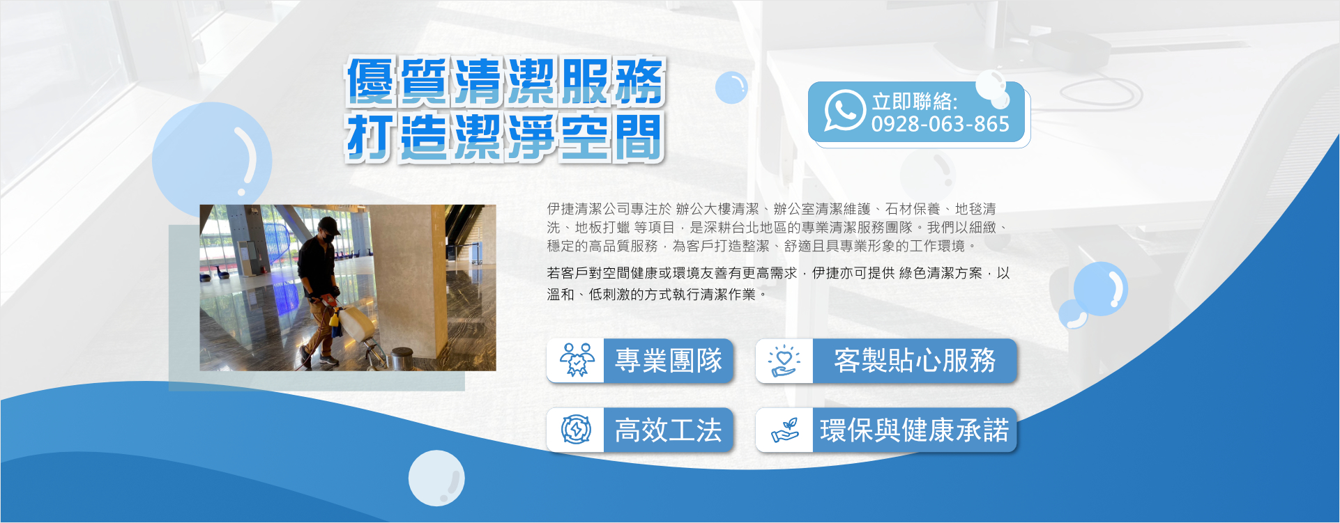 伊捷台北清潔公司是一家專業到府清潔公司,服務項目以辦公大樓、辦公室清潔服務、辦公室打掃、地毯清洗、地板打蠟為主。